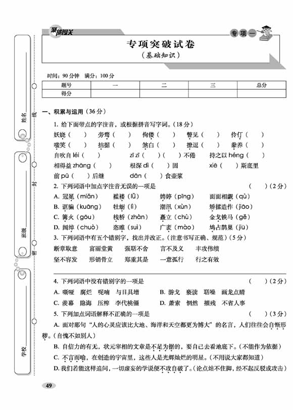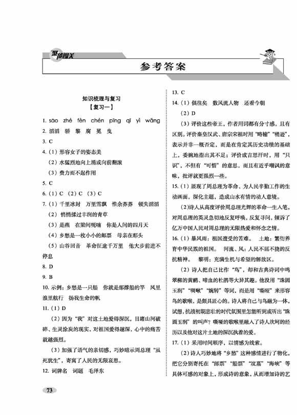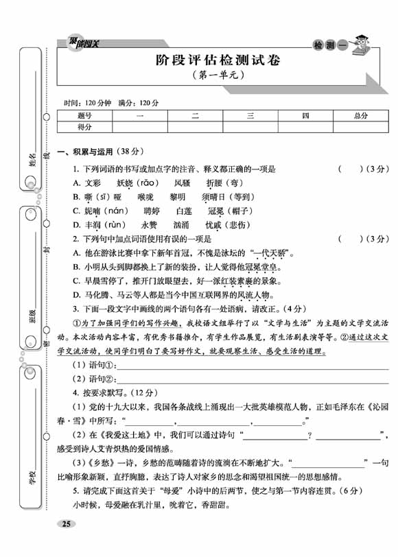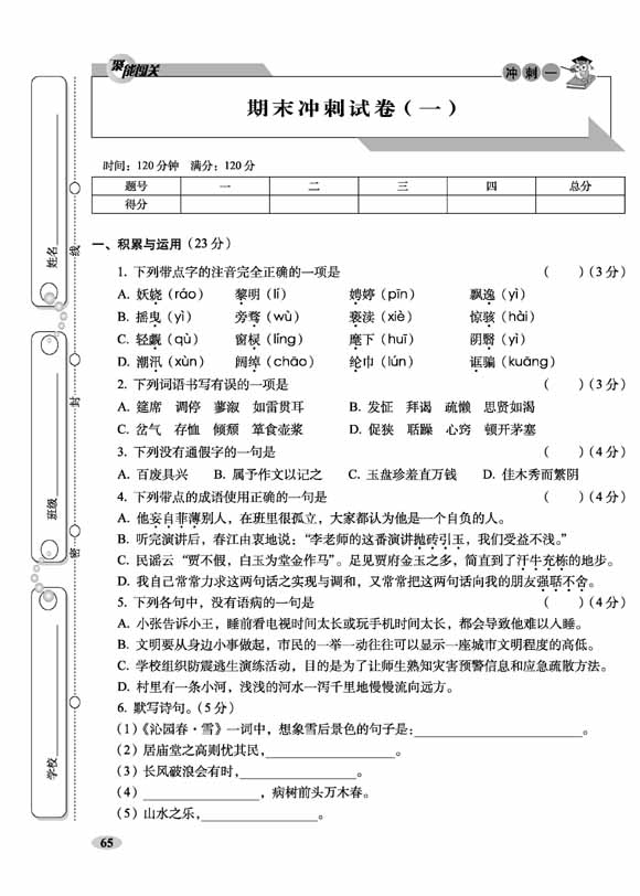 聚能闯关100分期末复习冲刺卷语文九年级上册23秋(人教版)