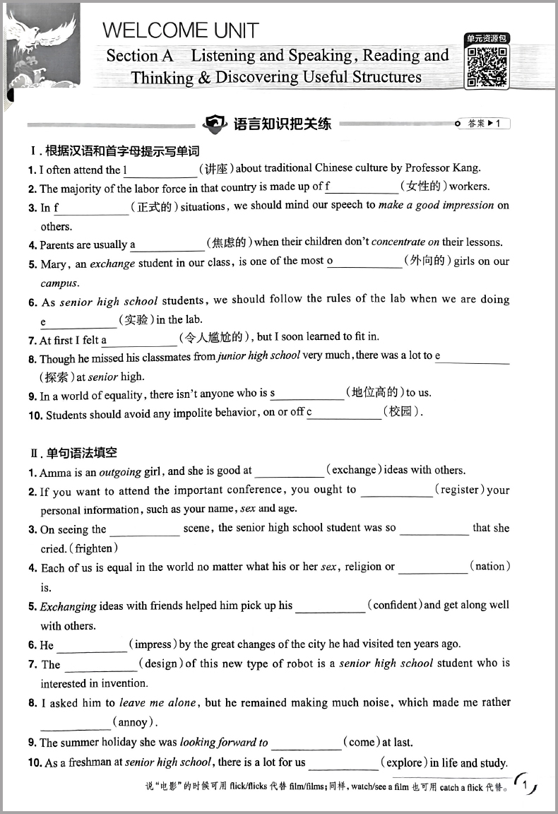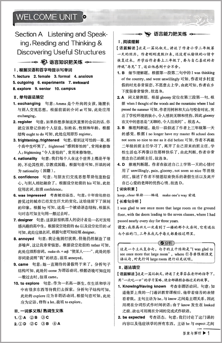 把关题高中英语必修第一册 人教版 金星教育