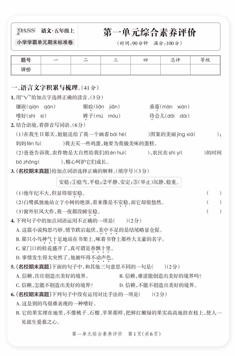 2023秋小学学霸单元期末标准卷五年级上册语文 人教版 绿卡图书