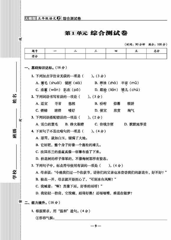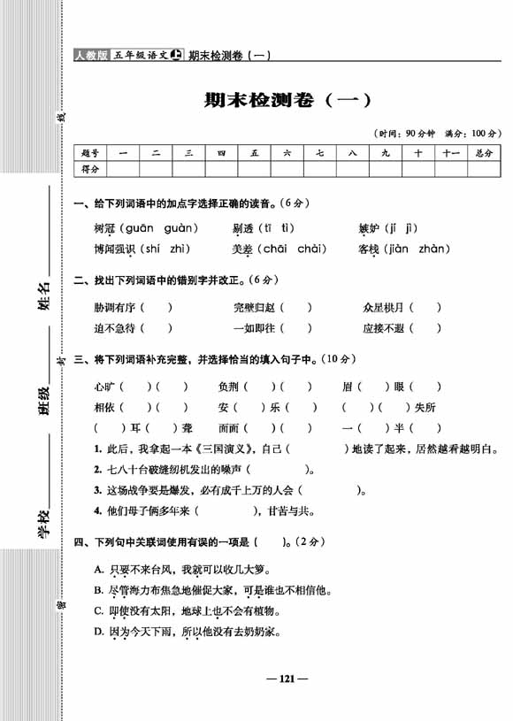 A+全程练考卷语文五年级 上册23秋人教版