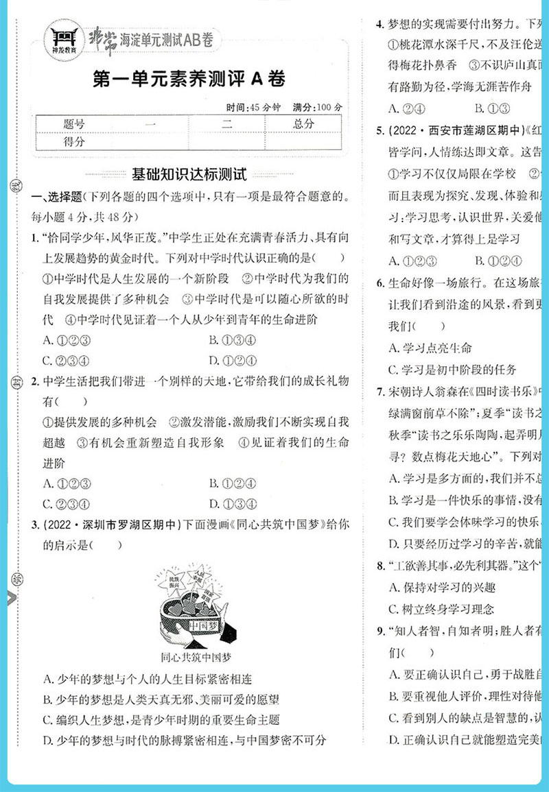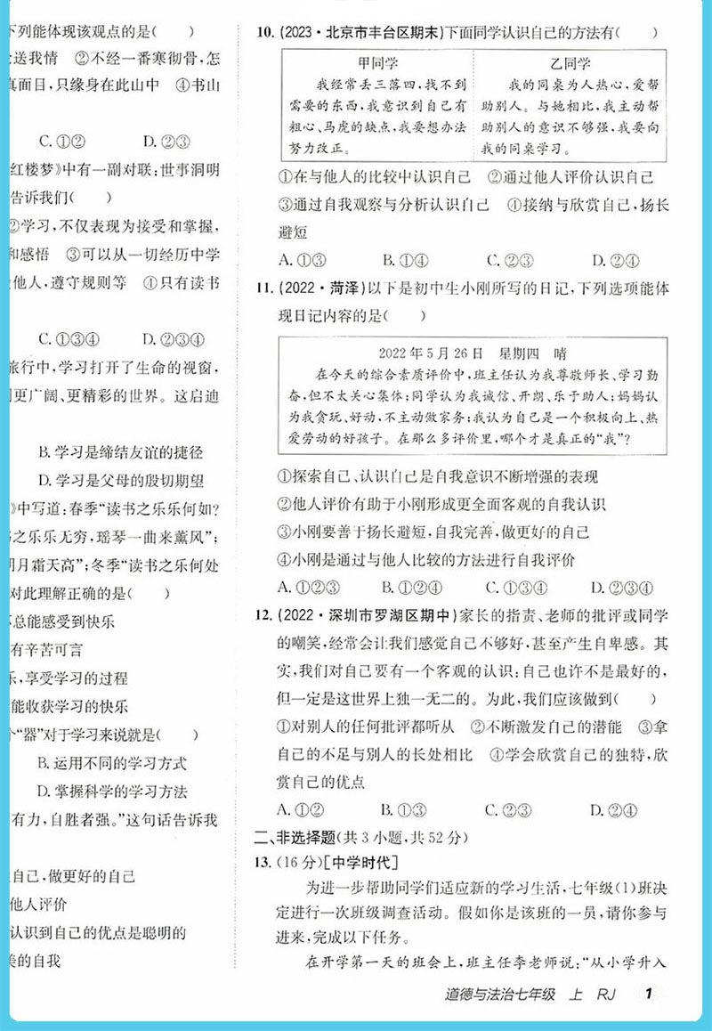 2024版非常海淀单元测试AB卷 七年级道德与法治上册人教版