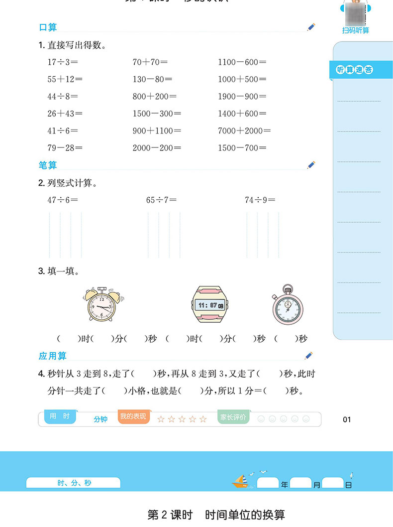一本 小学数学计算能力训练100分 三年级上册RJ版