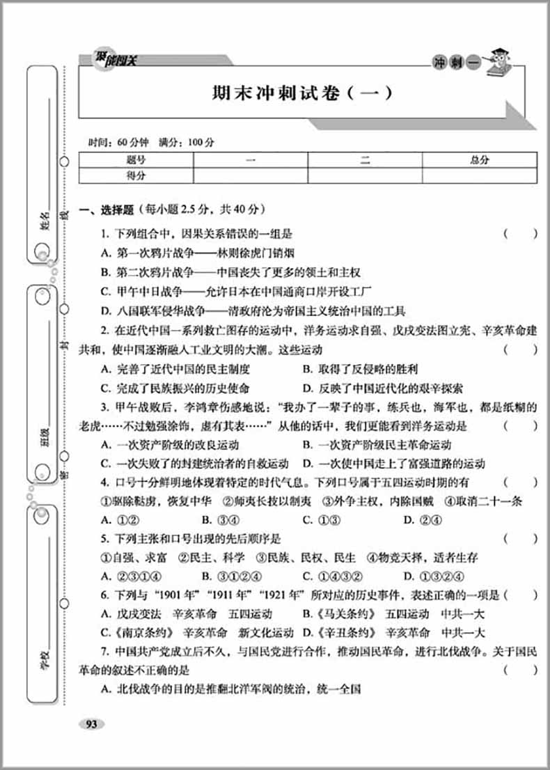 聚能闯关100分期末复习冲刺卷历史八年级上册 23秋人教版