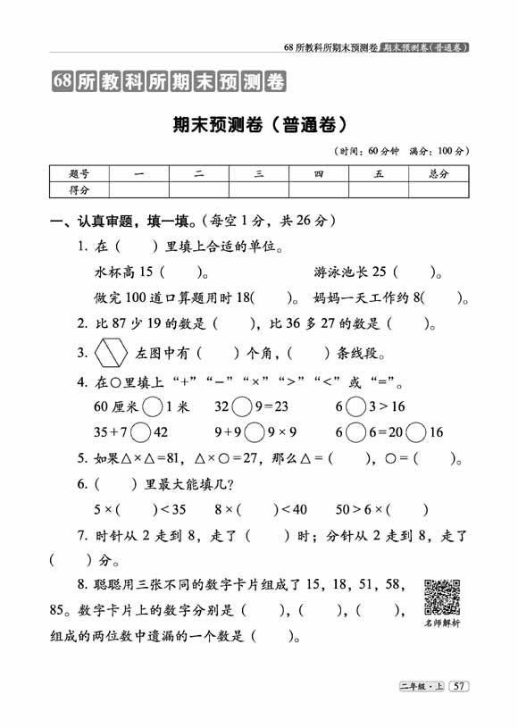 首页> 小学教辅> 二年级> 数学> 小学名校期末考试真题真卷精编数学2年级上册(人教版)
