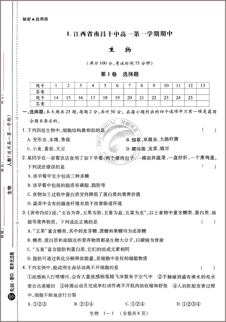 首页> 高中教辅> 高一年级> 生物> 24零失误期中期末优选卷高一生物上