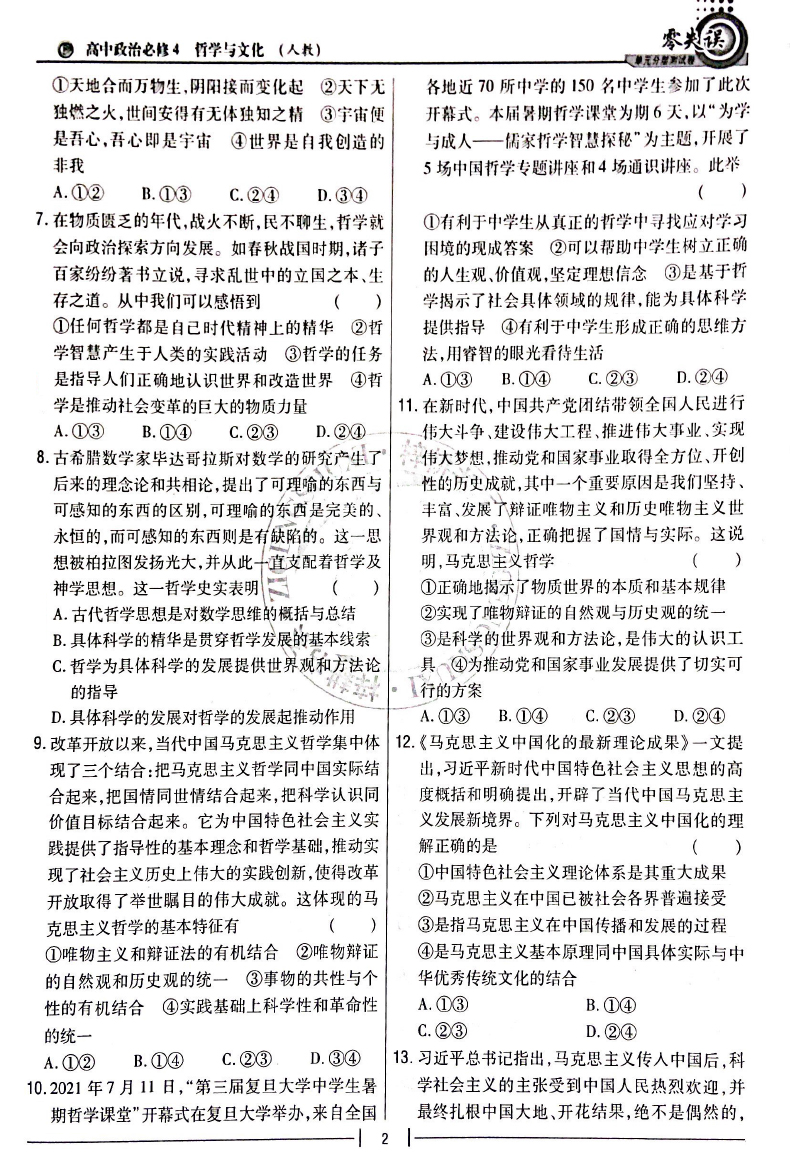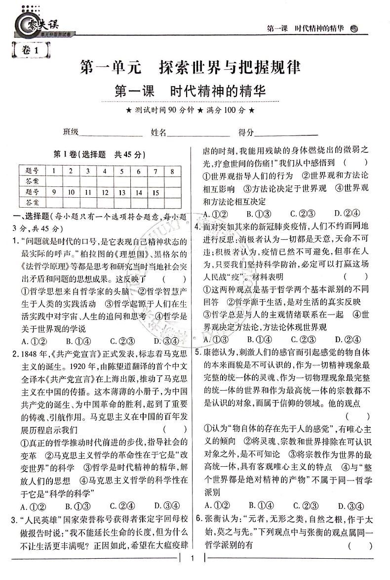 2023版 零失误单元分层测试卷高中政治必修4 哲学与文化