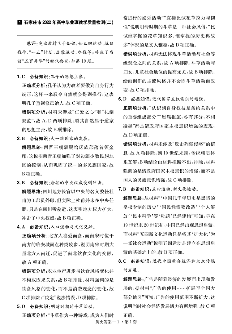 金考卷特快专递 历史(新高考) 第8期(临考冲刺卷)