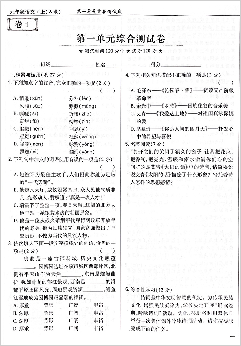首页> 初中教辅> 九年级> 语文> 完全考卷九年级上册语文人教版