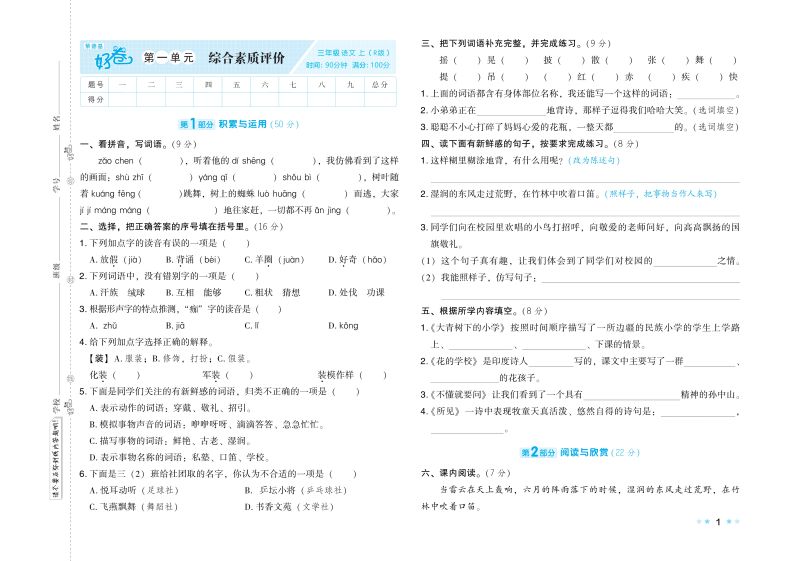2022秋 荣德基 好卷三年级语文上册人教版