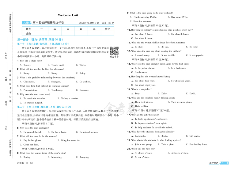 2023版金考卷活页题选 名师名题单元双测卷 高中英语 必修第一册 人教版