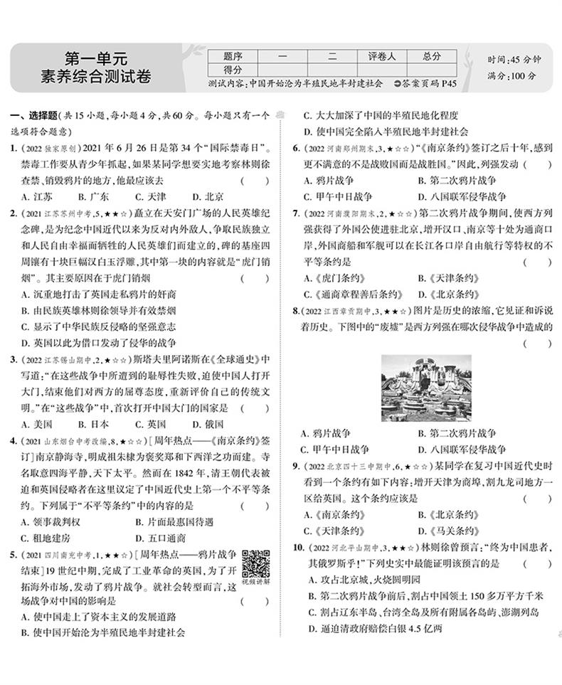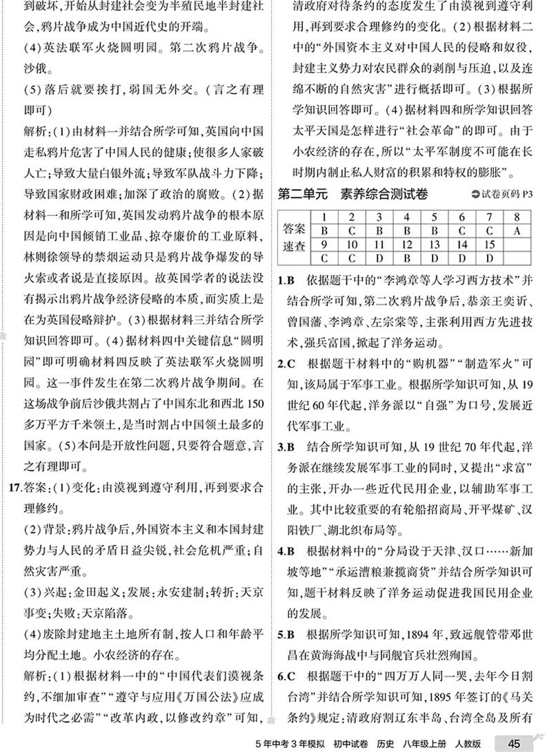 2023版 5年中考3年模拟初中试卷八年级历史上册