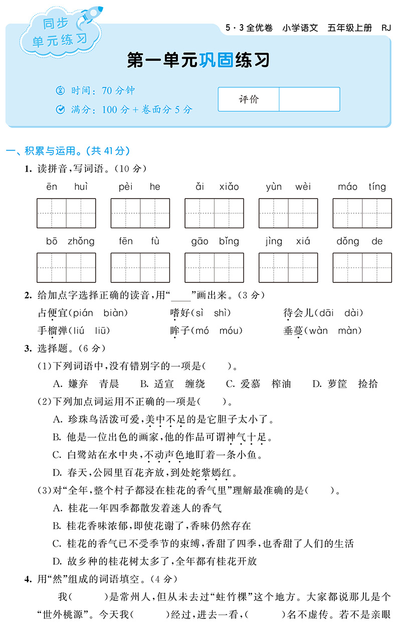 首页> 小学教辅> 五年级> 语文> 2022秋 53全优卷小学语文五年级上册