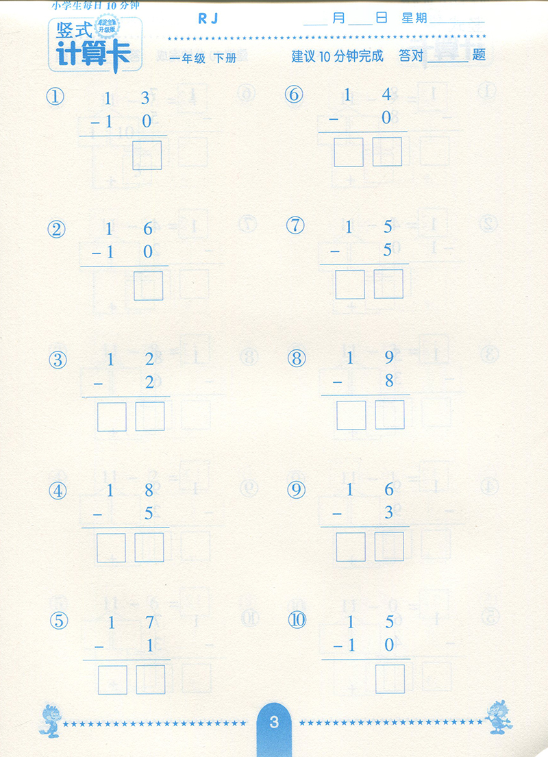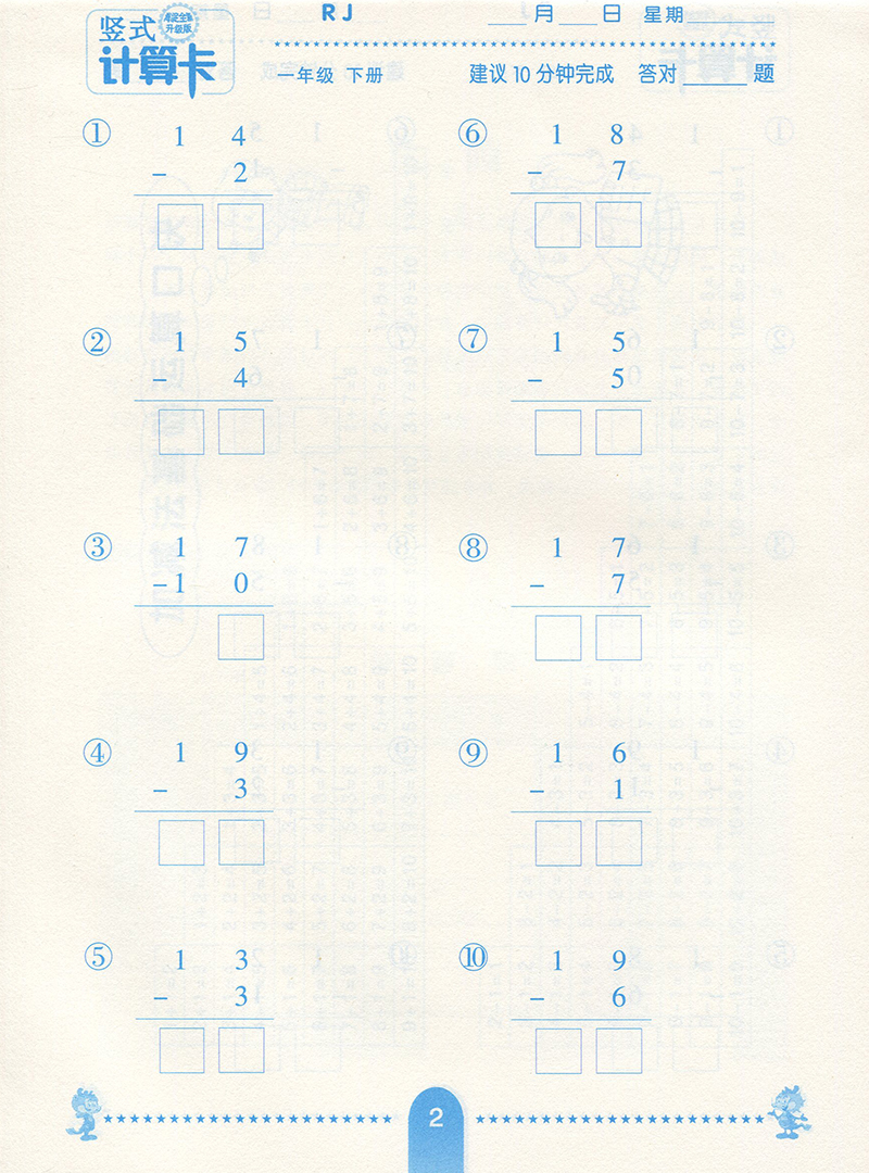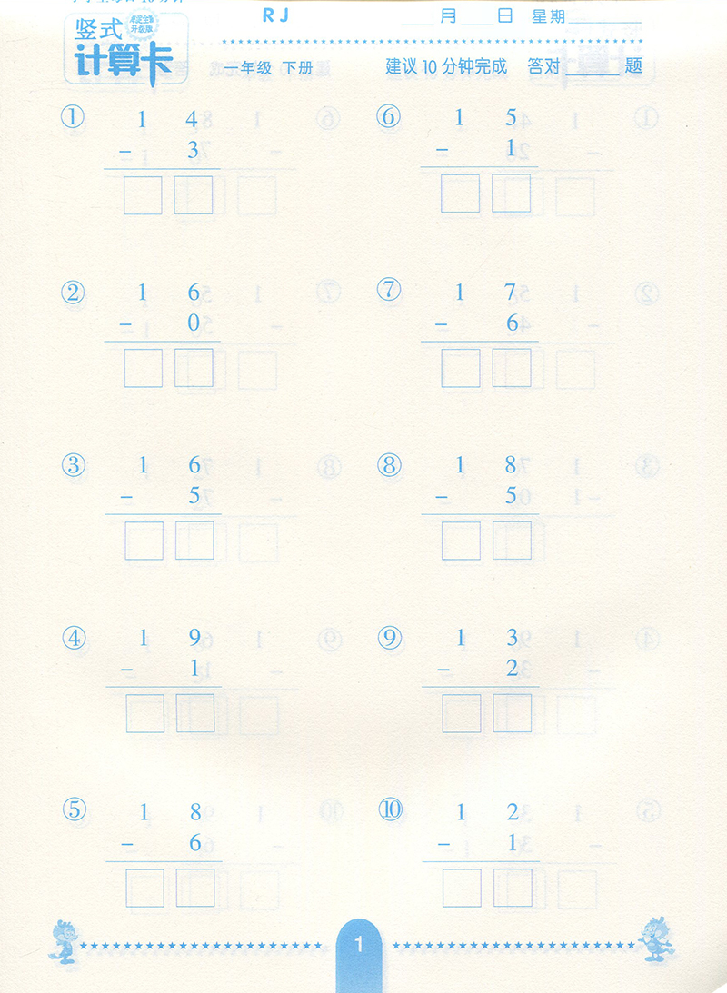 竖式计算卡 数学 一年级下册 RJ 人教版