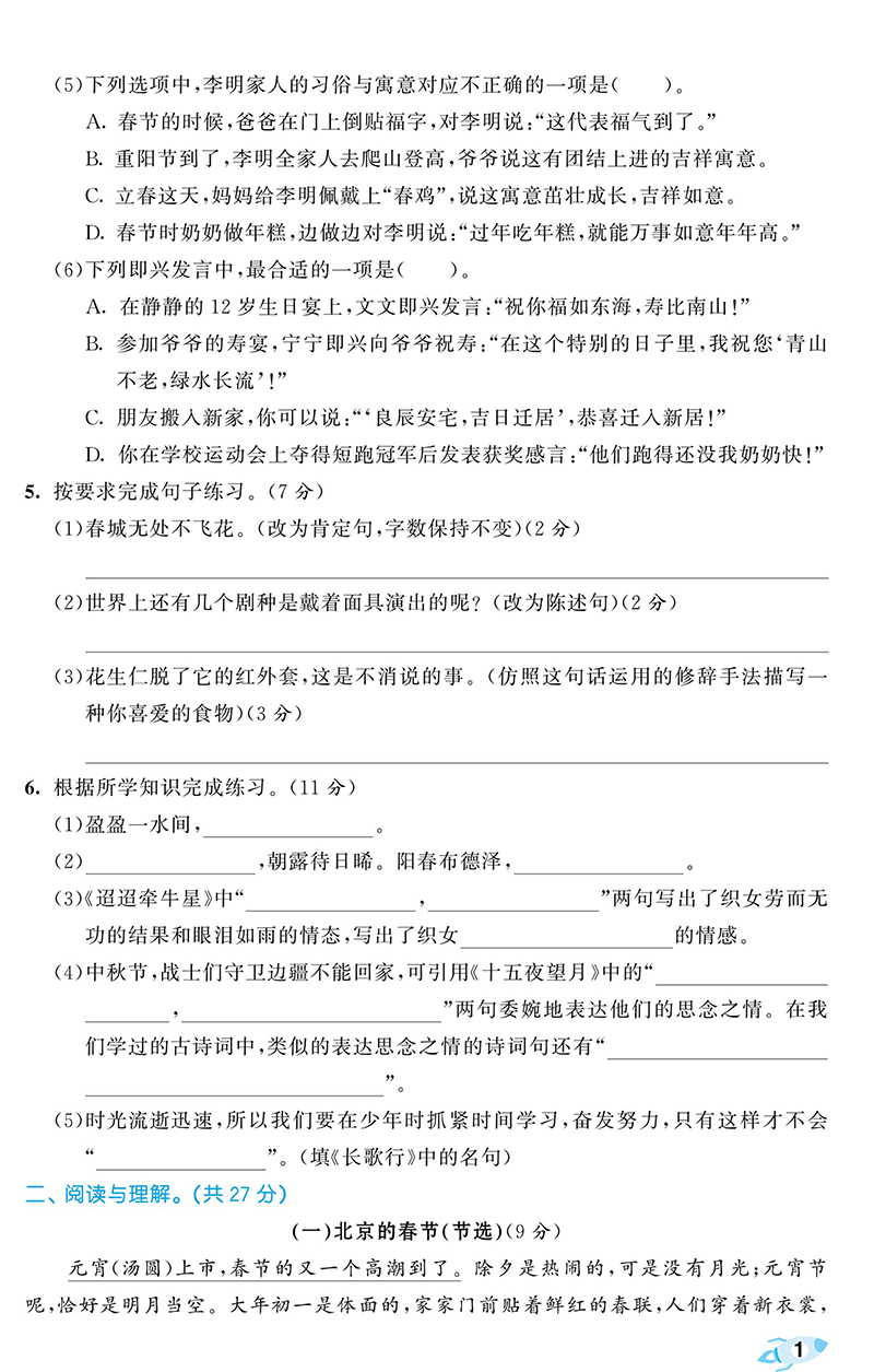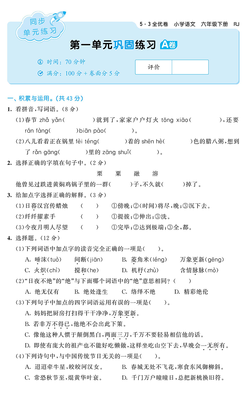 2023春季 53全优卷 小学语文 六年级下册 RJ 人教版