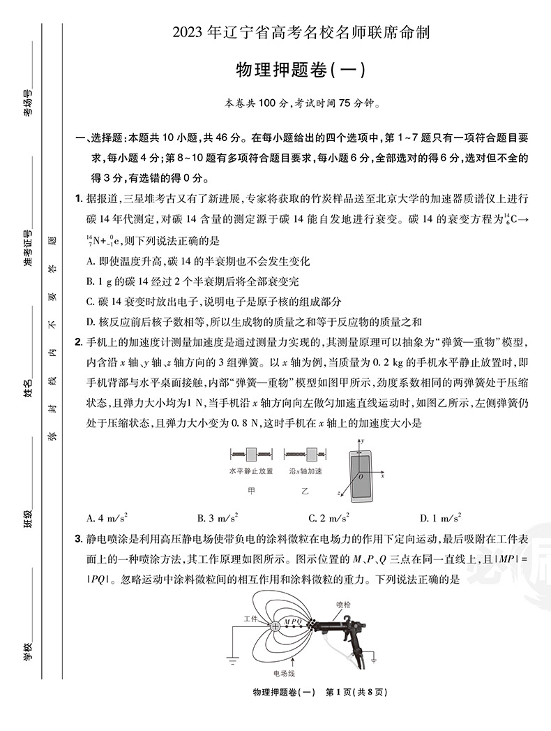 2023高考必刷卷 押题卷 新教材 物理选考 辽宁专用