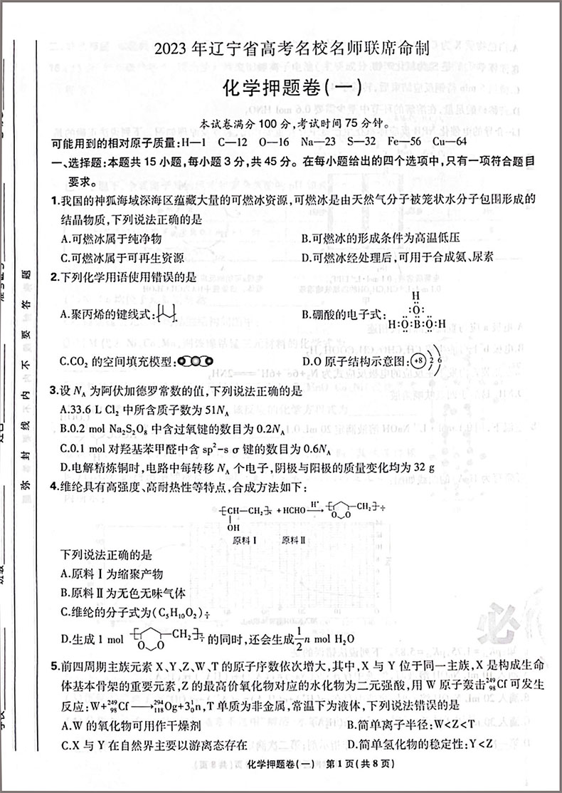 2023高考必刷卷 押题卷 新教材 化学选考 辽宁专用