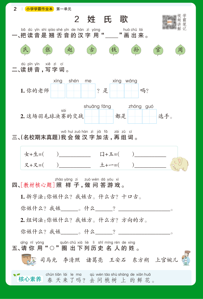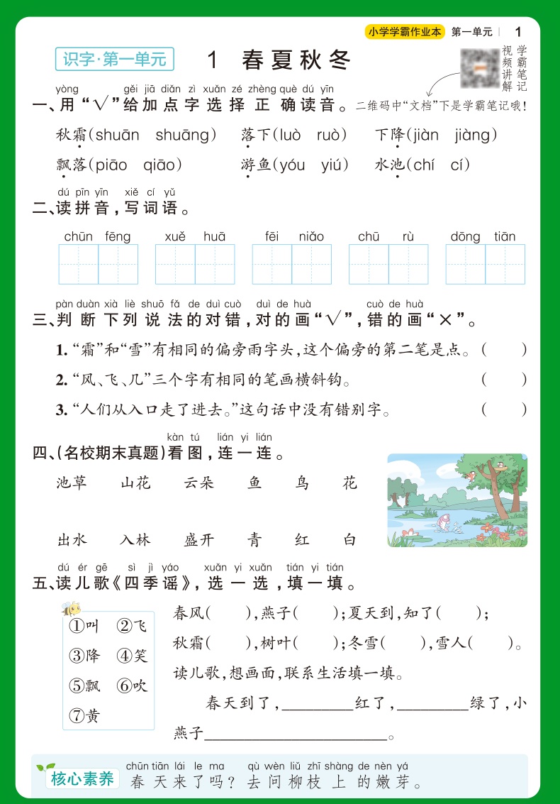 pass绿卡 小学学霸作业本语文一年级下册 人教版