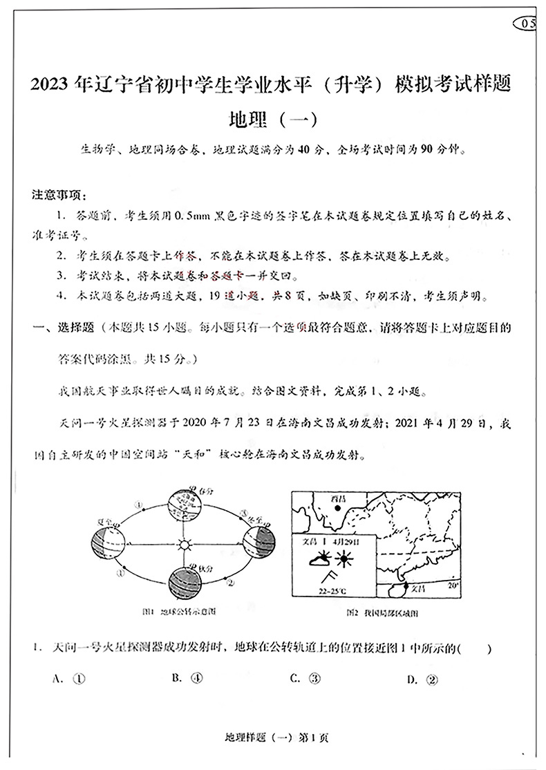 2023辽宁省统考开卷八年结业 地理评价体系及样题模拟卷